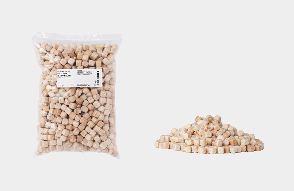 Add various scents of essential oil or fragrance oil, let it ripen for about a day to be absorbed into the pores of the hinoki cube for use as an air freshener.